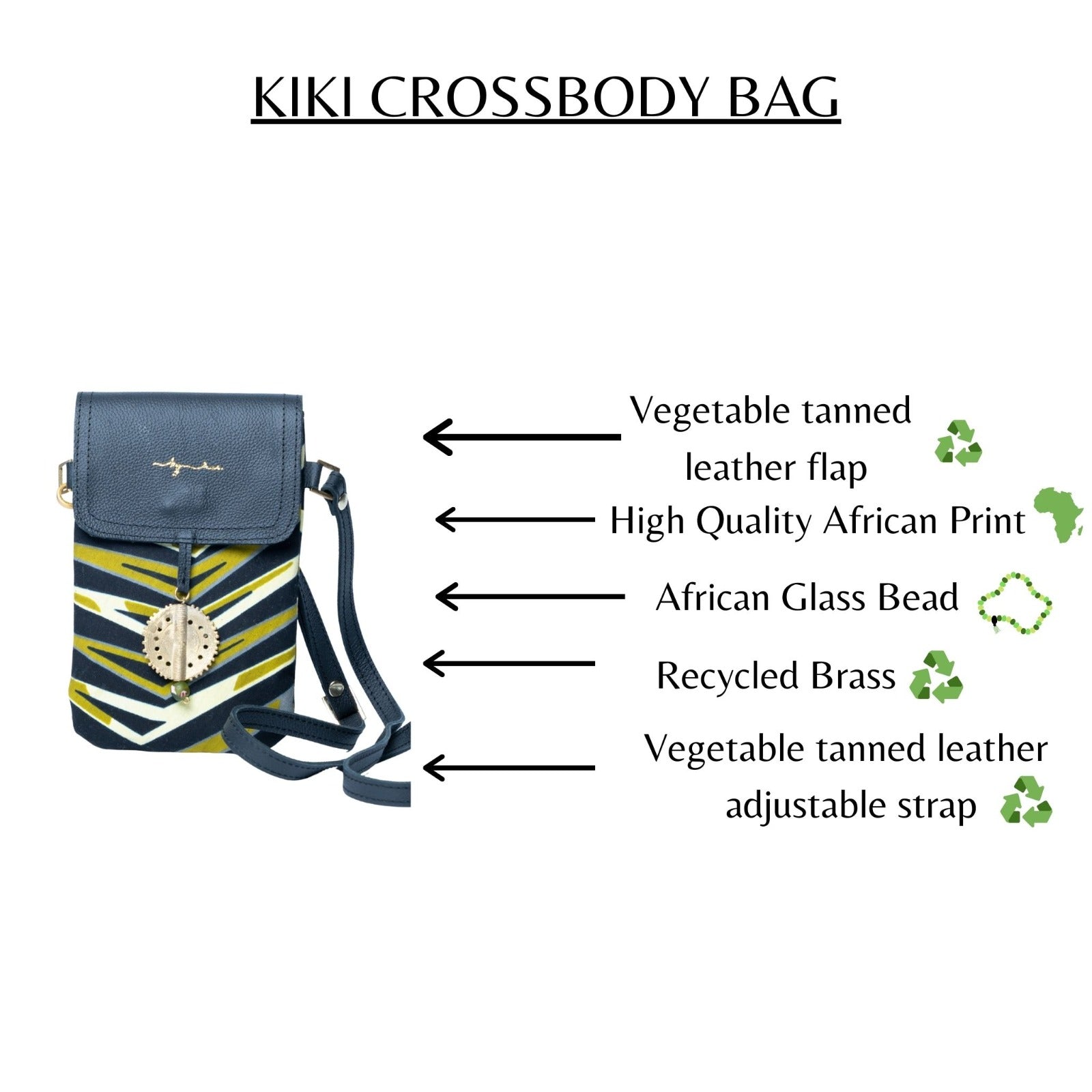 Our Ethical Kiki crossbody bag is made by women artisans in Kenya from High quality African print, Vegetable tanned leather and locally sourced brass.